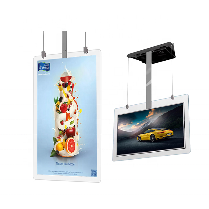 This dual sided display are equipped the screens on both sides, the outside window facing screen attact the pass by to your store, and the indoor facing screen helps prompt merchandise or company once they are inside.